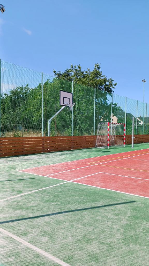 Na multifunkční hřiště byl již nainstalován basketbalový koš.